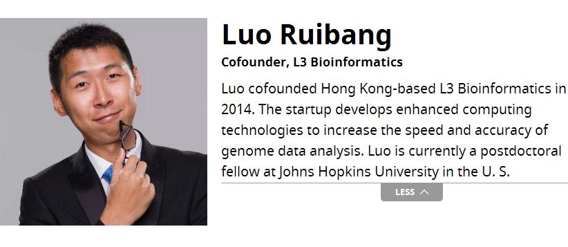Luo cofounded Hong Kong-based L3 Bioinformatics in 2014. The startup develops enhanced computing technologies to increase the speed and accuracy of genome data analysis. Luo is currently a postdoctoral fellow at Johns Hopkins University in the U. S.