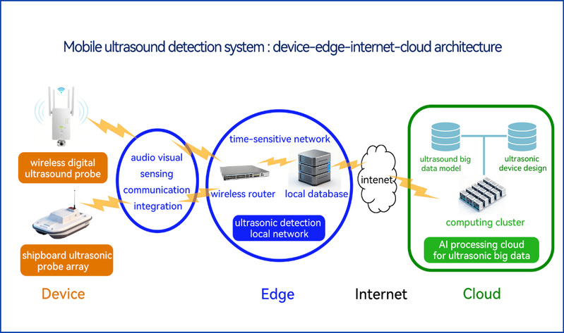 Oriented to the national strategies including Smart Oceans, Healthy China, Rural Revitalization, etc., the Center has systematically researched on the related technologies of the whole industry chain of mobile ultrasonic detection for more than twenty years. The Center has pioneered a "Device-Edge-Internet-Cloud" architecture for mobile ultrasonic detection systems, which enables 24/7 ultrasonic detection for various targets in mobile environments and uploading the data to the cloud wirelessly, so as to facilitate the integration with the data obtained by other detection means (such as optics, radar, etc.), and realize monitoring of the detection target covering entire spatial domain, entire temporal domain, multi-dimensions, multi-granularities, and high-precision. Using artificial intelligence technologies, large-scale and multi-modal collaborative analysis technology for detection targets can be constructed to meet the needs of different application scenarios.